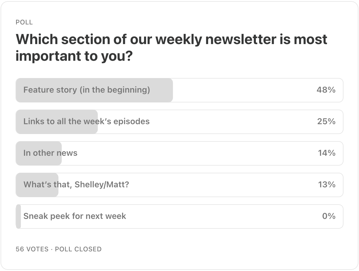 Here are your results from last week’s poll. Based on your feedback, we’re going to put more time into writing great feature stories, and maybe try out some new segments to replace ones that aren’t that important to you.